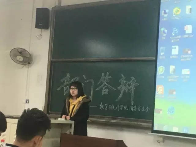3:30分整,与会人员全部到齐。在两位主持人致开幕词后,答辩会正式开始。本次答辩会共分三个环节。第一个环节有两个阶段,即部长上台答辩和评委在答辩后为各部门评分。参与本次答辩的是团委学生会的所有部门,答辩顺序由各部长抽签产生。按照抽签顺序各部长依次上台,借助精心制作的PPT完成答辩。