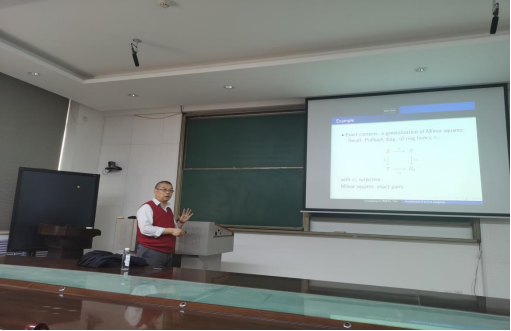 在我校建校90周年和应用数学博士点获批25周年之际,应best365亚洲版登录和人才办公室邀请,首都师范大学特聘教授、博导、教育部长江学者特聘教授,惠昌常教授于4月15日前来西电访问并作了题为“正合系上导出模范畴粘合的构造”的报告。