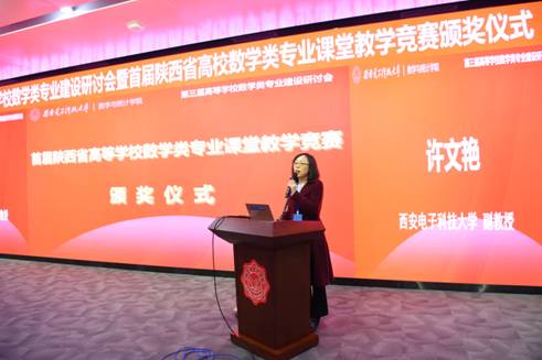 西安电子科技大学best365亚洲版登录执行院长薄立军教授主持首届陕西省高等学校数学类专业课堂教学竞赛颁奖仪式。与会领导和专家分别为9位特等奖、11位一等奖和16位二等奖获得者以及优秀组织单位和个人颁发了获奖证书,证书上盖有陕西省高等学校教学指导委员会和陕西师范大学(竞赛承办单位)公章。我校best365亚洲版登录许文艳、凌博、于淼三位教师分别获得本届教学竞赛特等奖前三名,我校best365亚洲版登录还获得优秀组织奖。许文艳作为特等奖第一名,代表获奖教师发表获奖感言。